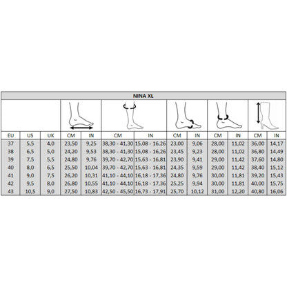 Les bottes Nina sont spécialement conçues pour les pieds larges (largeur H), chevilles larges et mollets larges XL. Leur fermeture éclair sur toute la longueur permet un enfilage facile et rapide.